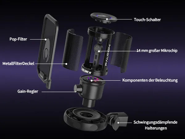 Das elastische Gummiband ist fest mit der Stoßhalterung verbunden, um Vibrationsgeräusche durch intensives Tippen auf der Tastatur und Klicken mit der Maus zu reduzieren. Der abnehmbare Pop-Filter ist fest mit dem Gaming-PC-Mikrofon verbunden, um das Geräusch zu eliminieren, das durch Ihre aufregenden Worte im Spiel entsteht. Die Metallscheibenbasis verhindert, dass sich das Podcast-Mikrofon bewegt, wenn es bei intensivem Spielen auf den Schreibtisch trifft.