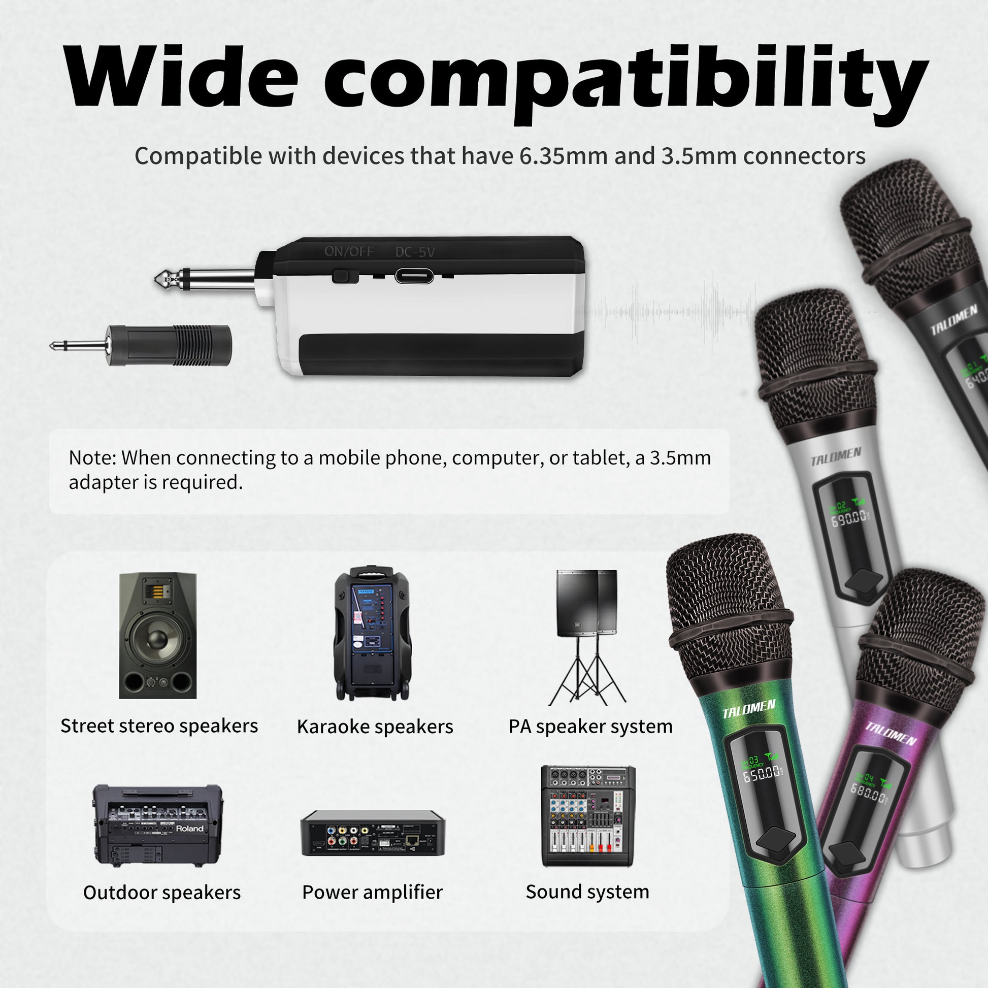 This wireless microphone is compatible with all audio devices with a 6.35 mm (1/4") jack and devices with the correct 3.5 mm (1/8") audio input. Other types of adapters can be used with more devices. Before purchasing this product, please make sure the device you are connecting to has a suitable microphone input port to ensure the best experience.