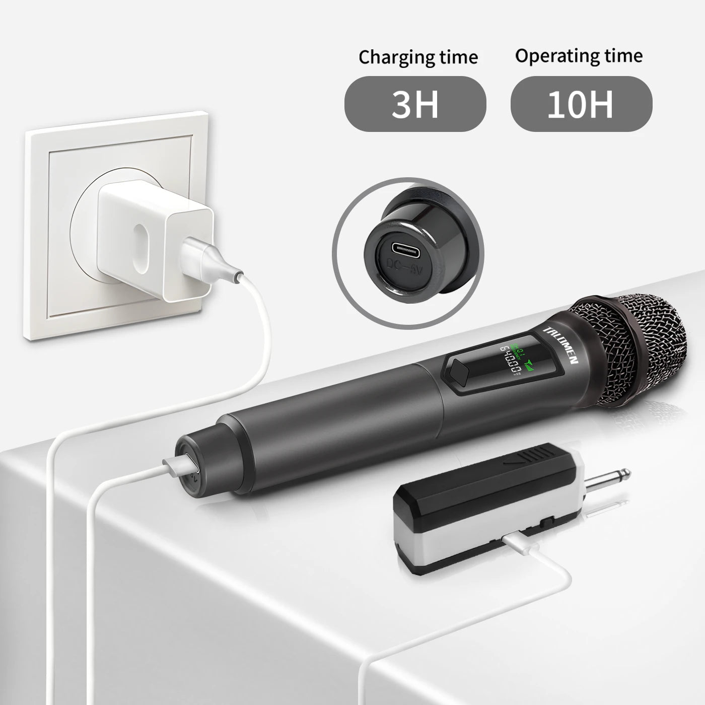 Both the wireless microphone and receiver are equipped with a 1200mAh rechargeable lithium-ion battery. After actual testing, a 3-hour charge can provide 10 hours or more of use. The wireless microphone and receiver can be charged directly using the included USB-Type C charging cable without removing the battery.