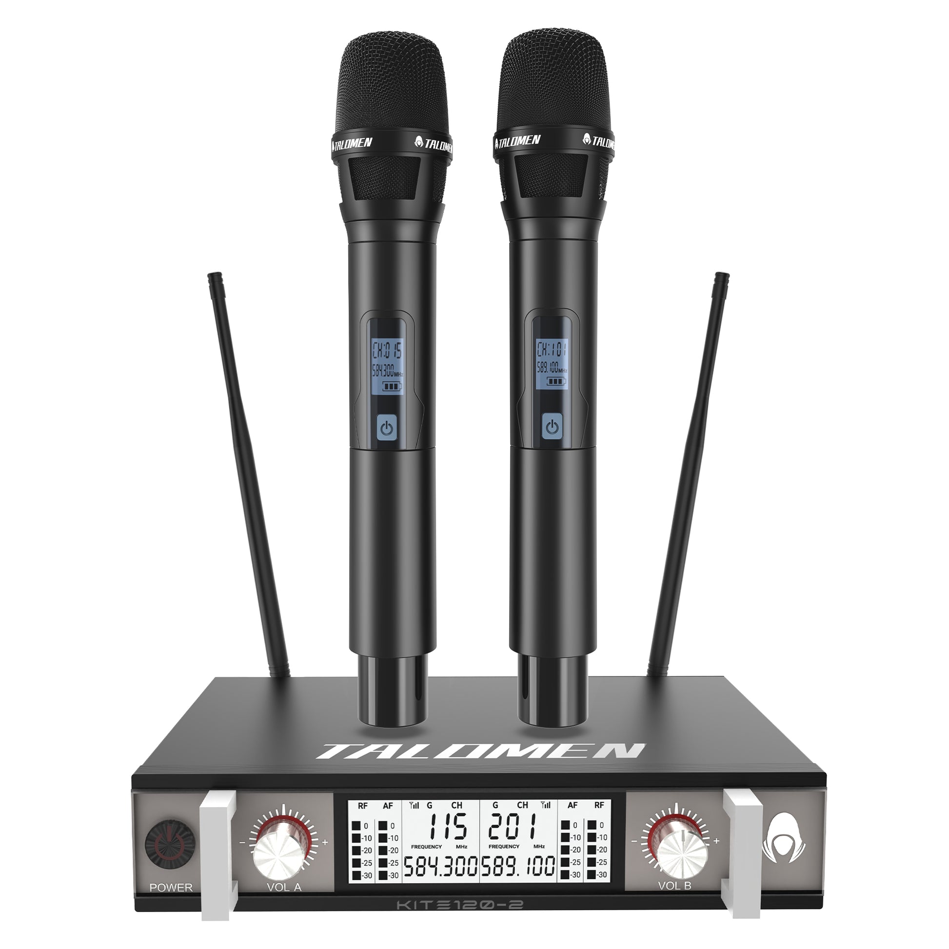 Talomen K120は、デュアルチャンネルUHFワイヤレスマイクシステムです。カスタムアンテナ付きの受信機と、プロ仕様にチューニングされたダイナミックマイク2本が付属しています。教会の礼拝、カラオケ、ホームパーティーなどに最適です。